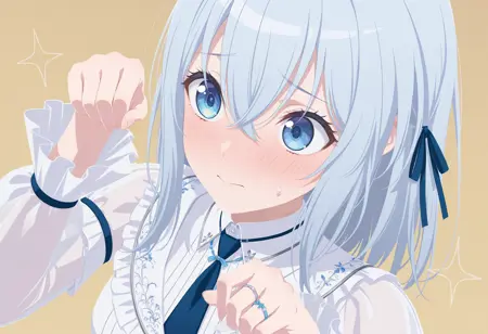 태그: 파란 눈, 눈 사이 머리카락, 연한 파란색 머리, 중간 길이 머리,