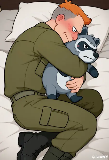 solo,male focus,Enos Fry,droopy eyes,orange hair,short hair,athletic,lanky,scrawny,military uniform,boots,belt,1man,Adult man,Shaved hair