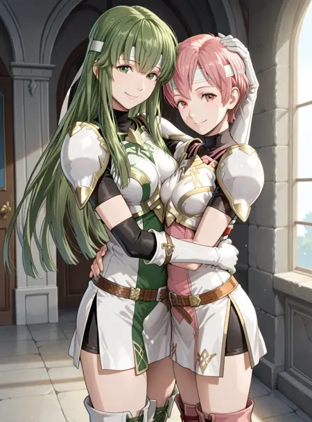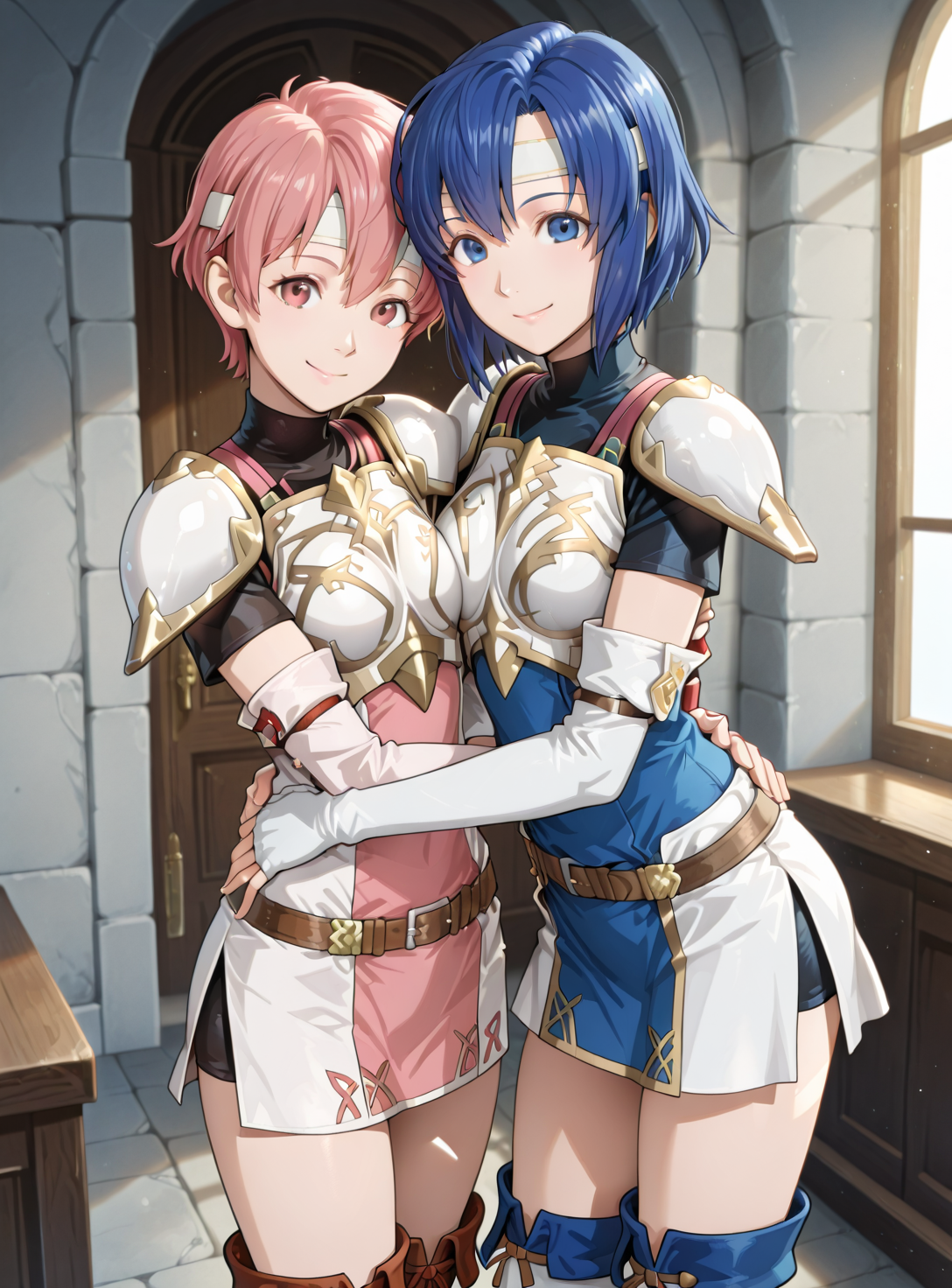 I managed to do it. It is stable output for a single unit and up to two people, but a little unstable for three people. When another LoRa is added, it becomes even more unstable. Specifically, Est's output tends to be dragged down by Catria. Since Est's hair style has not been consistent since the creation stage, the training images have become sparse, which may have resulted in more diffuse training compared to the other characters. After reviewing the trigger word tags and adjusting the number of images, we managed to get the output to this point. We recommend that you read the above notes on the generation of the images.