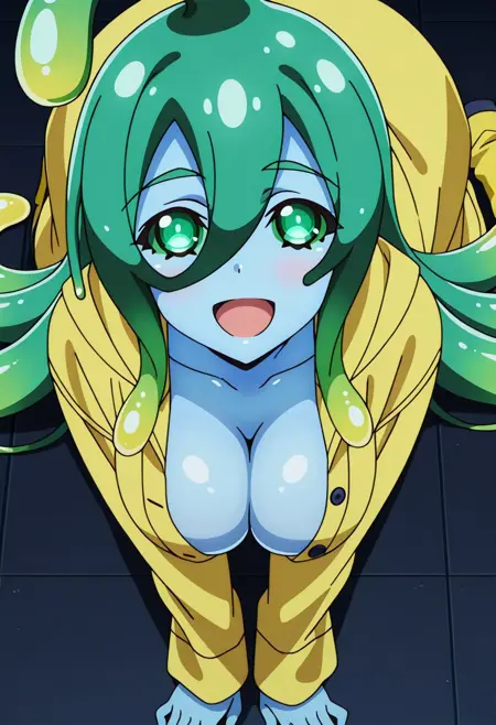 SuuRaincoat, 1girl, solo, green eyes, large breasts, curvy, wide hips, adult female, adult face, green sclera, blush, colored sclera, monster girl, green hair, blonde hair, gradient hair, multicolored hair, hair between eyes, very long hair, tentacle hair, colored skin, blue skin, slime girl, huge ahoge, shiny skin, smoothy skin, yellow raincoat, long sleeves, yellow rubber boots,