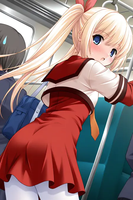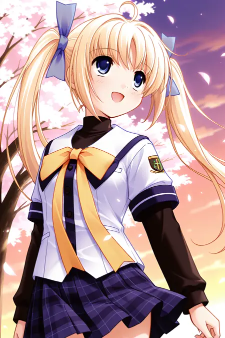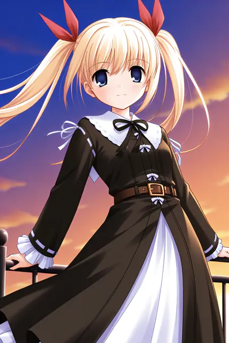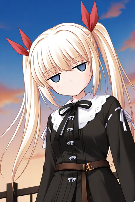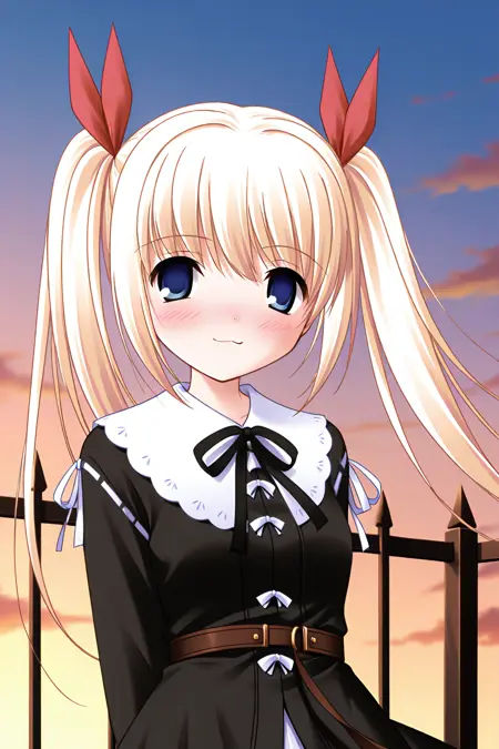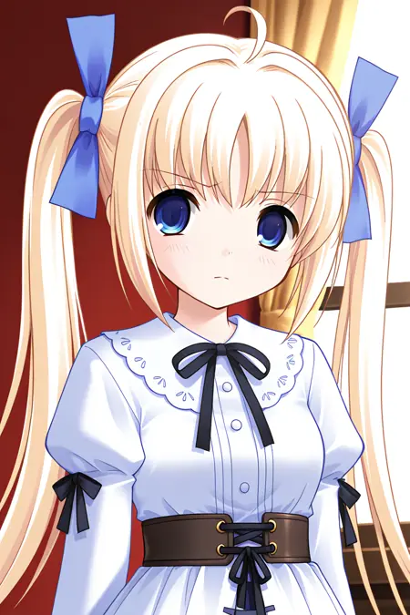 mikoshiba rea,blonde hair,long hair,hair between eyes,hair intakes,sidelocks,twintails,hair ribbon,red ribbon,petite,