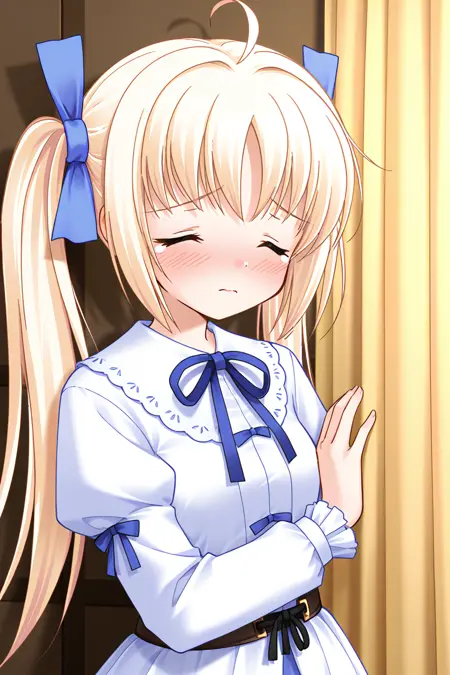 mikoshiba rio,blue eyes,blonde hair,long hair,parted bangs,hair intakes,sidelocks,twintails,ahoge,hair ribbon,blue ribbon,petite,