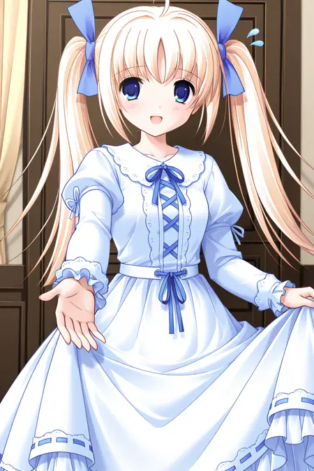 white dress,neck ribbon,blue bow,cross-laced clothes,frilled dress,lace-trimmed dress,ribbon-trimmed dress,juliet sleeves,arm bow,long dress,petticoat,