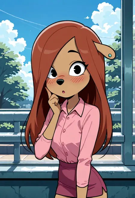 1girl, solo, fauxn, female furry, long hair, black eyes, earrings, miniskirt, pink shirt