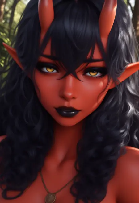 Shiann - 角、尾巴、红色皮肤、黄色眼瞳、丰满嘴唇、妆容、黑发、卷发、交叉刘海、曲线身材、挺拔胸部、大胸、纤细腰身、宽臀、极长黑色指甲