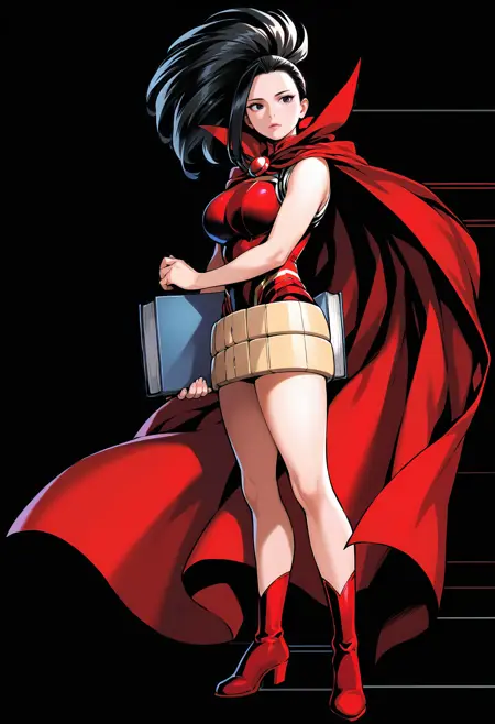 披风,乳房,红色鞋履,紧身衣,裸露肩膀,红色紧身衣,靴子,高跟鞋,头发向后束起,书本,腰带,高跟靴,红色披风,无袖,超级英雄,裸露手臂,裸露腿部,腰带裙