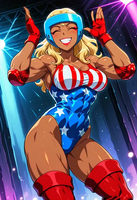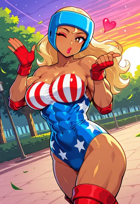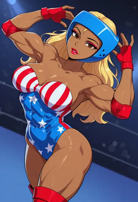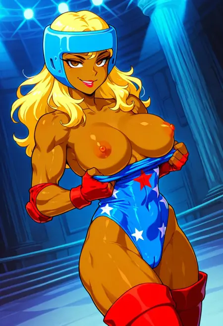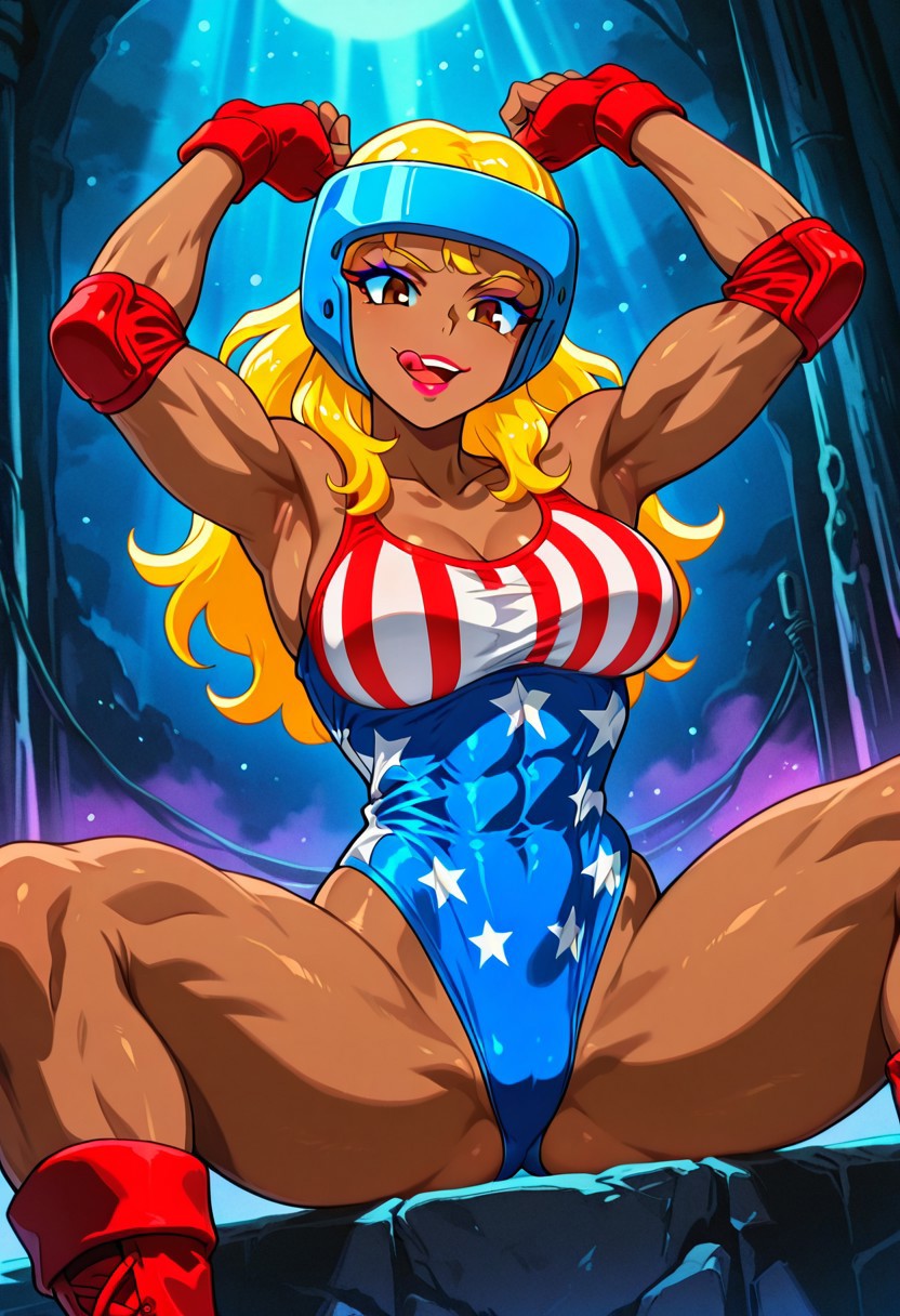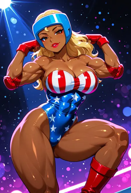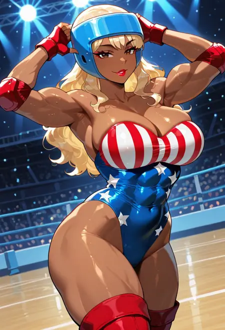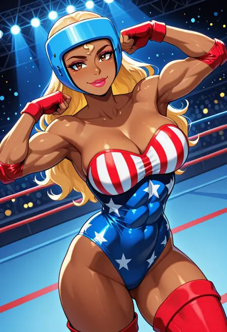 PlatinumEC, 1girl, solo, 곡선형 몸매, 근육질 여성, 검은 피부, 검은 피부 여성, 금발 머리, 긴 머리, 파란색 복싱 헬멧, 갈색 눈, 두꺼운 입술, 쇄골, 이두근, 큰 가슴, 줄무늬 유방선, 파란색 애국심 풍긴 레오타드, 팔꿈치 패드, 큰 엉덩이, 두꺼운 허벅지, 복근, 근육질 다리, 근육질 팔, 빨간 손가락 없는 장갑, 빨간 허벅지까지 오는 굽신 부츠, 메이크업, 립스틱, 근육질 몸매,