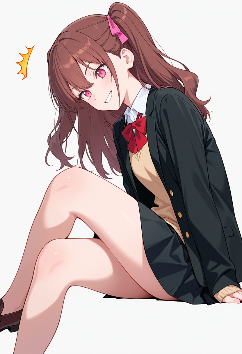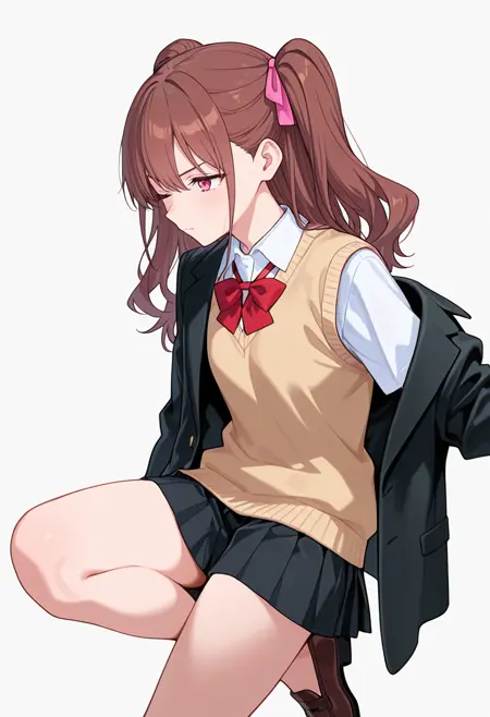 black jacket,collared shirt, sweater vest,pleated skirt, black skirt,red bowtie,hair ribbon,loafers,