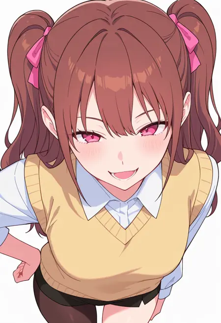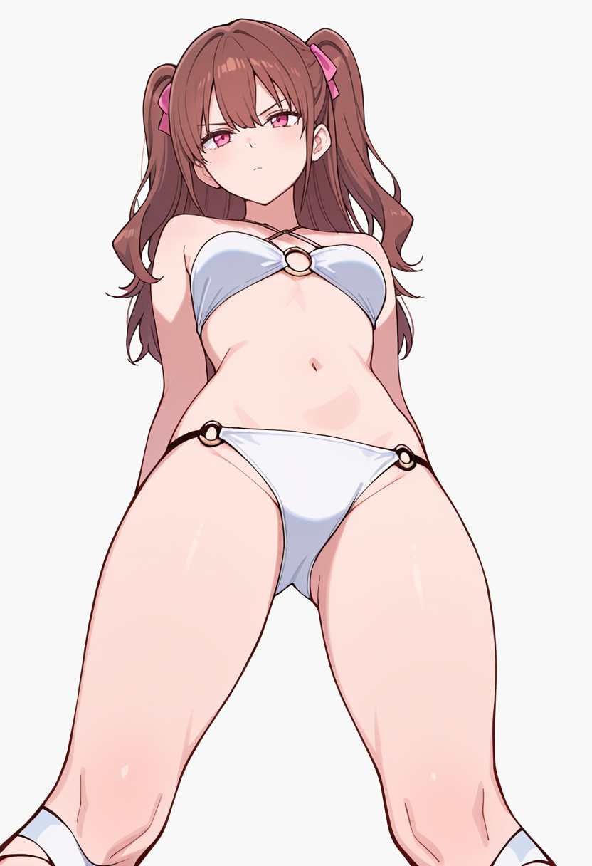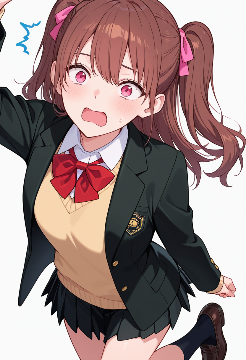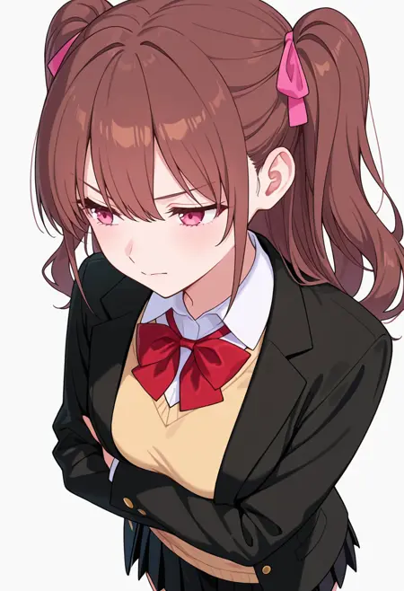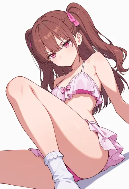 mikari_cnr, 1girl, brown hair,long hair,two side up, pink eyes, bangs,