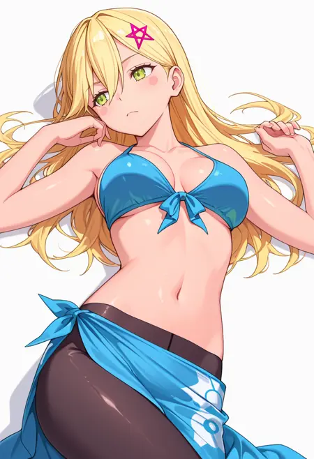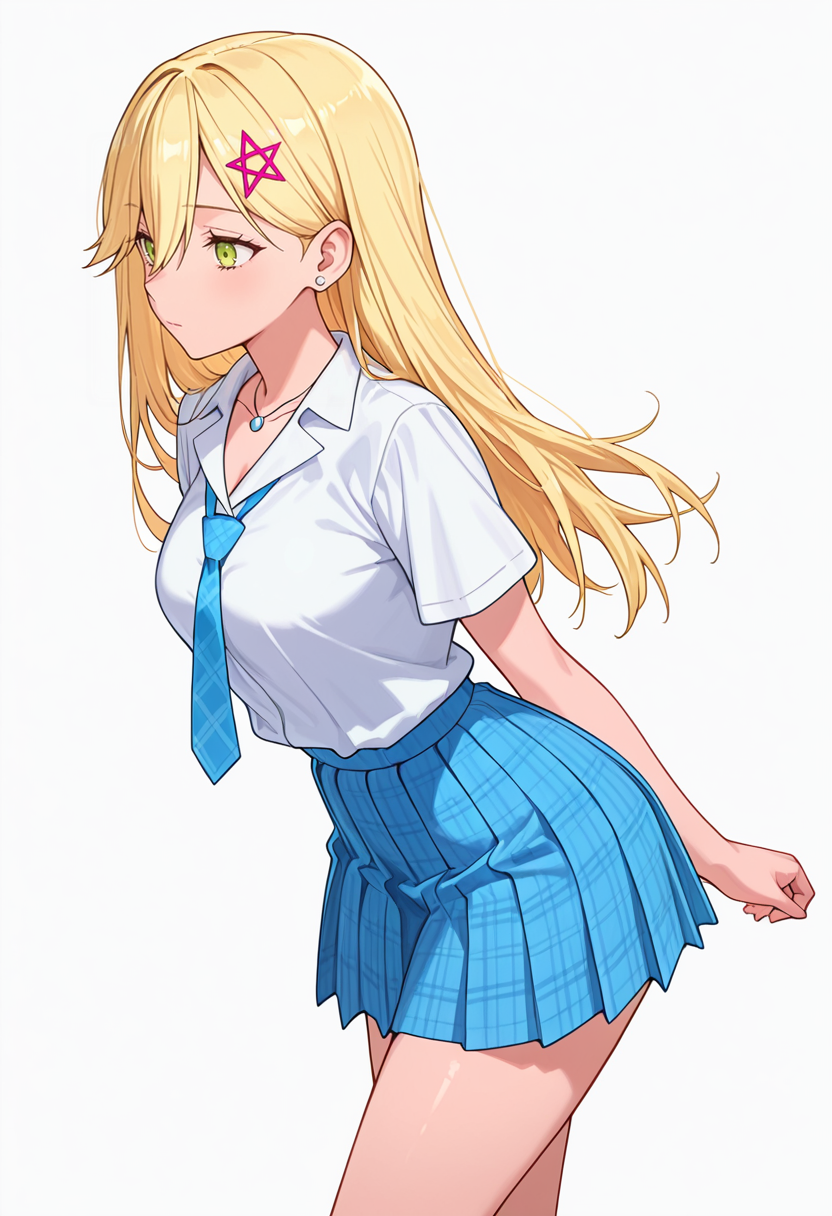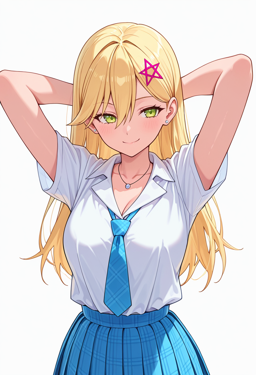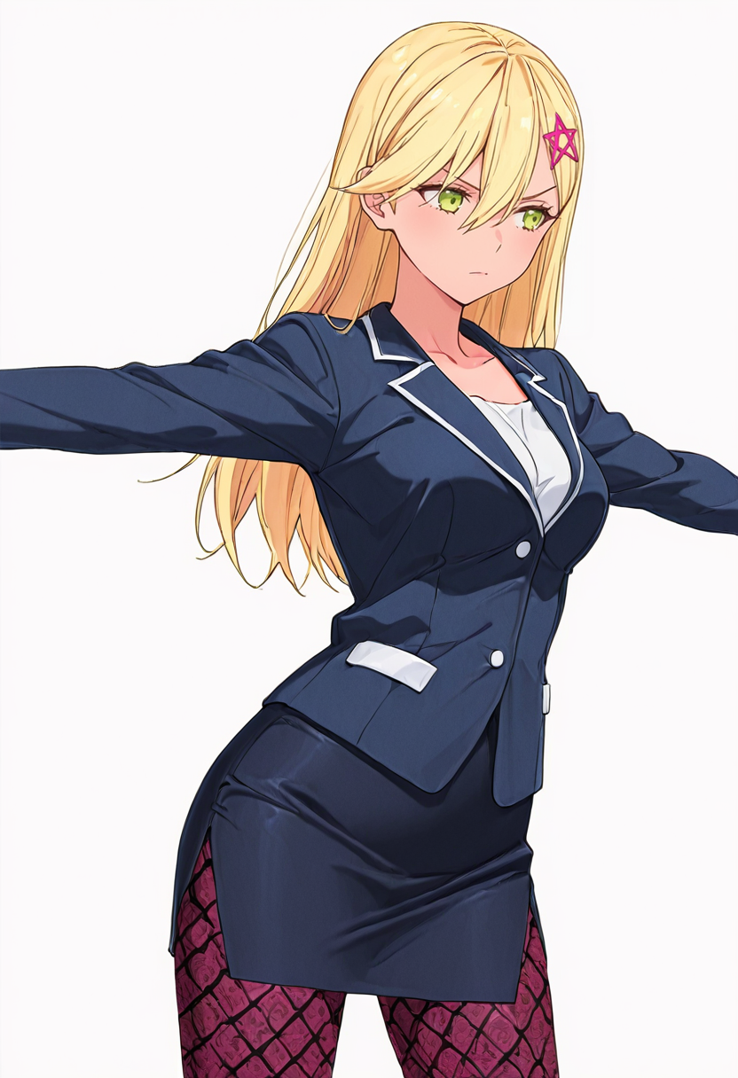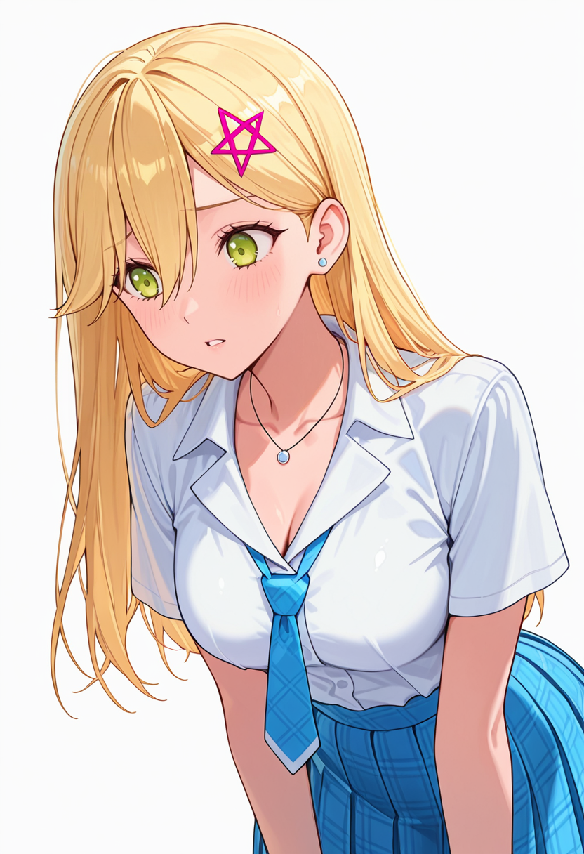 aria_cnr, 1girl, blonde hair,long hair, green eyes,hair between eyes, shiny hair, medium breasts,star hair ornament,
