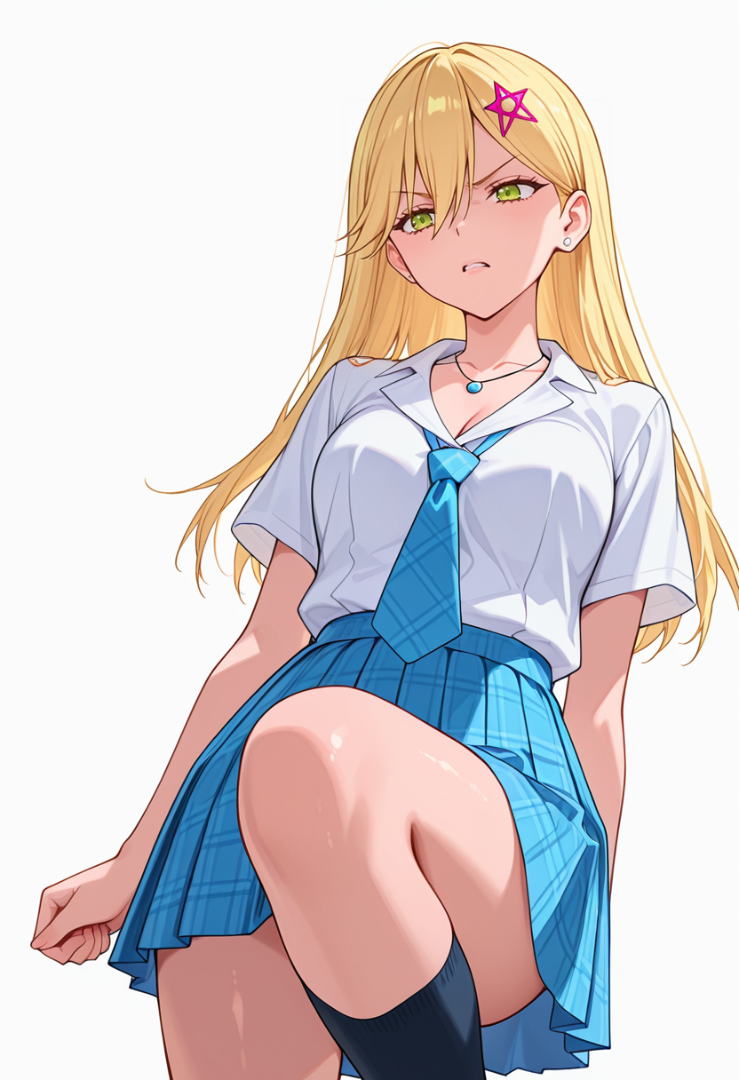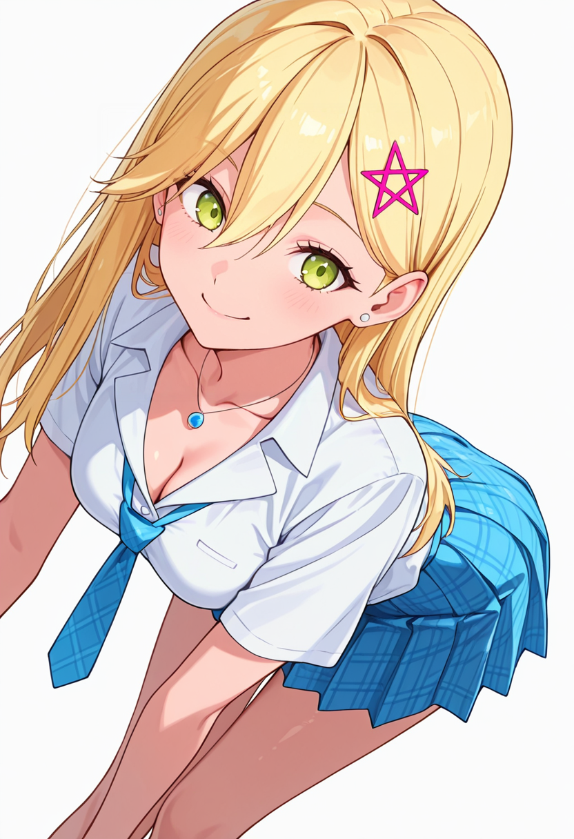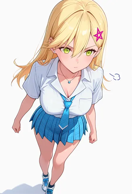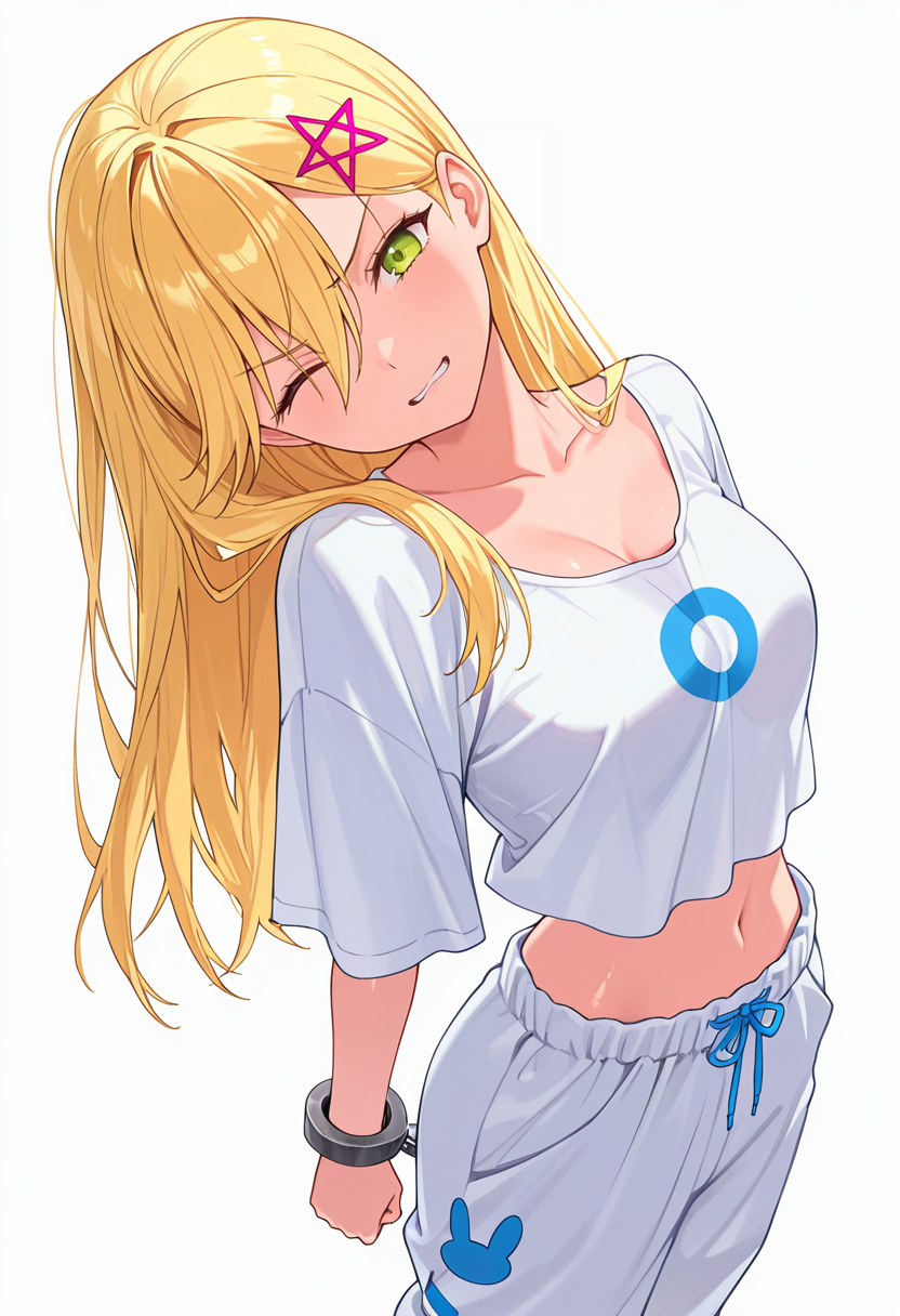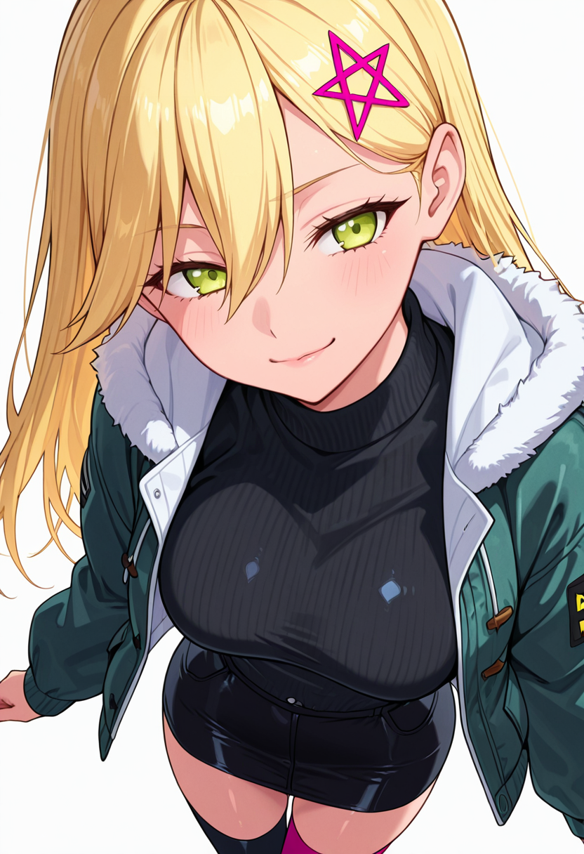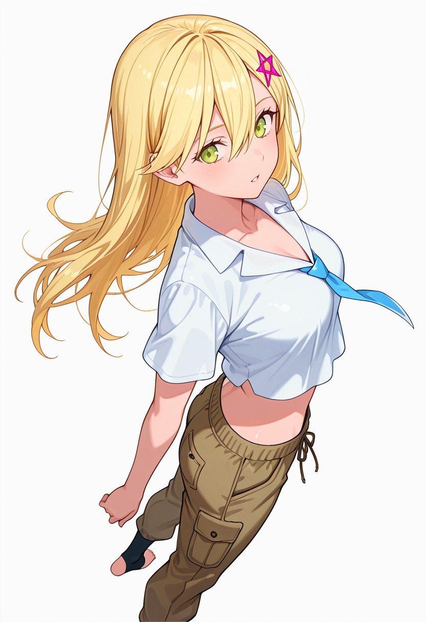 aria_cnr, 1girl, blonde hair,long hair, green eyes,hair between eyes, shiny hair, medium breasts,star hair ornament,