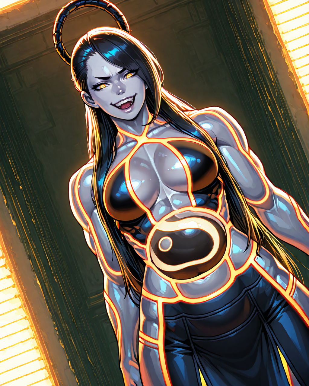 black hair, long hair, smooth hair, bang, yellow eyes, grey skin, shiny skin