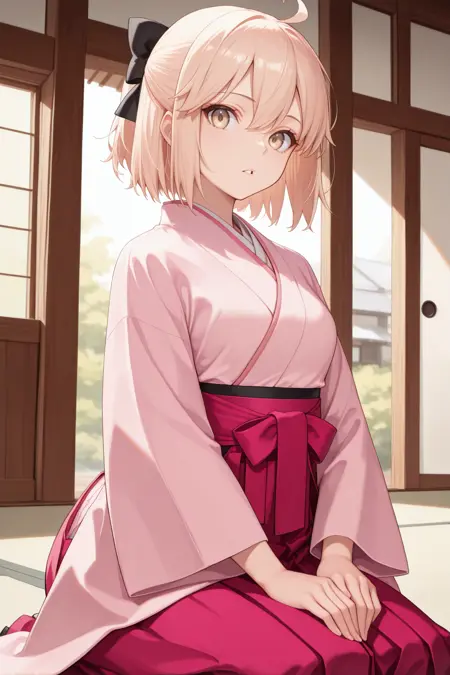 沖田総司(1段階目)には、「oktsji, light blonde hair, short hair, half updo, ahoge, hair between eyes, yellow eyes, black bow, hair bow, pink kimono, red hakama skirt, wide sleeves」を追加してください。