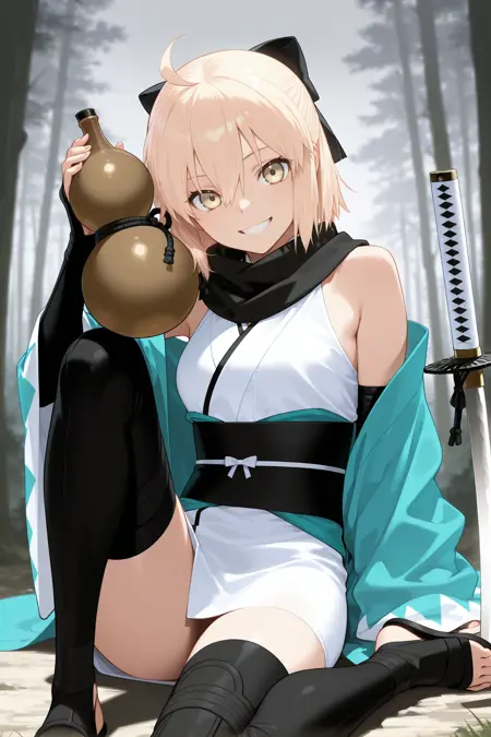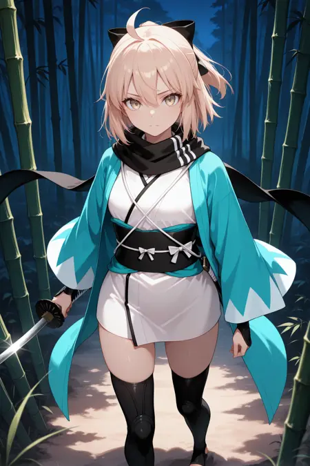 沖田総司(3段階目)には、「oktsji, light blonde hair, short hair, half updo, ahoge, hair between eyes, yellow eyes, black bow, hair bow, aqua haori, black scarf, white kimono, sleeveless kimono, short kimono, black obi, wide sleeves, black thighhighs, toeless legwear」を追加してください。