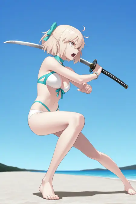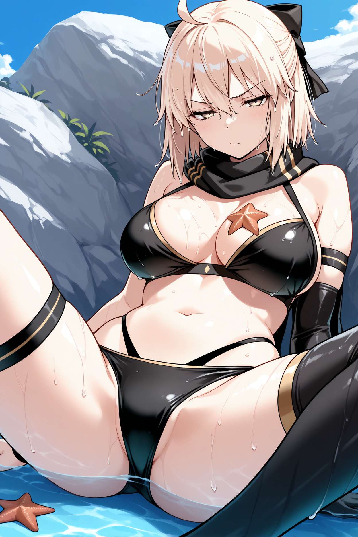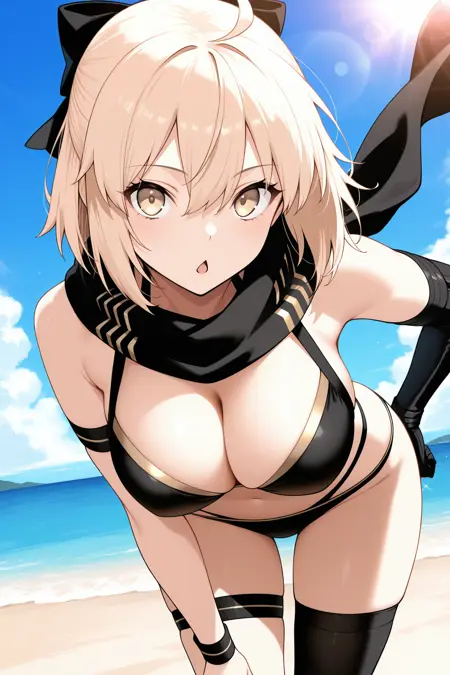 沖田J.総司(1段階目)には、「oktsji, light blonde hair, short hair, half updo, ahoge, hair between eyes, yellow eyes, black bow, hair bow, black scarf, black bikini, highleg bikini, layered bikini, gold trim, armband, black glove, single glove, elbow glove, wristband, thigh strap, black thighhighs, uneven legwear」を追加してください。