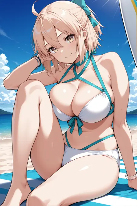 沖田J.総司(3段階目)には、「oktsji, light blonde hair, short hair, half updo, ahoge, hair between eyes, yellow eyes, aqua bow, hair bow, aqua straps, aqua choker, criss-cross halter, white bikini, front-tie bikini top, bracelets」を追加してください。