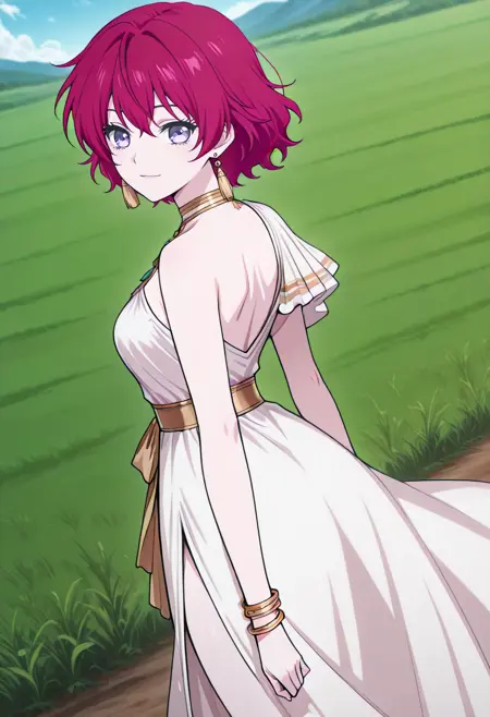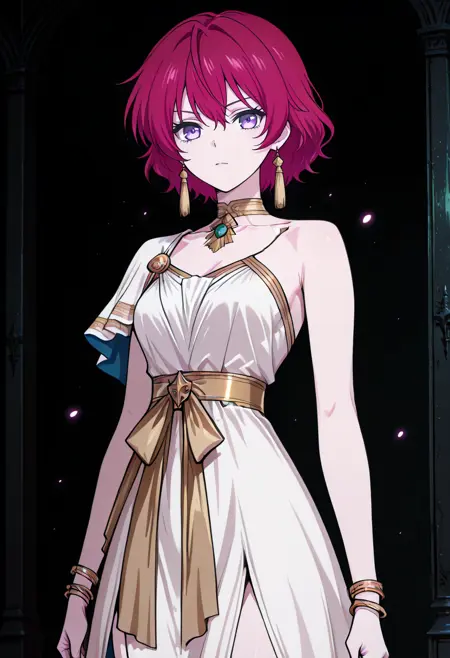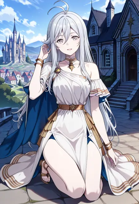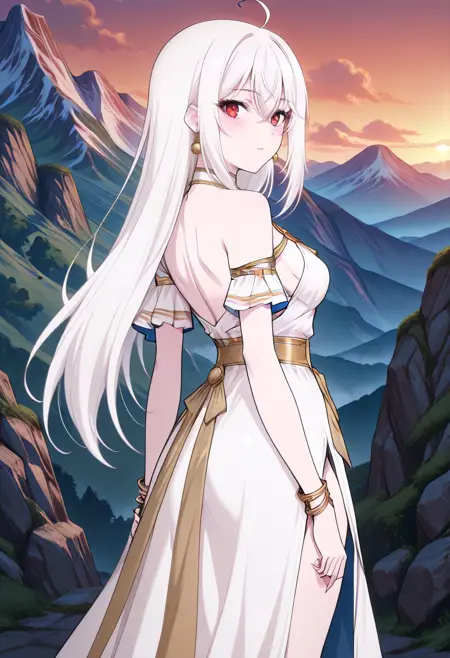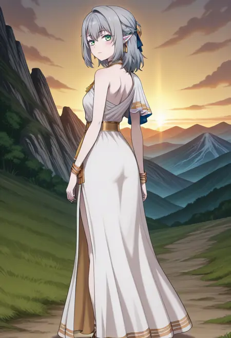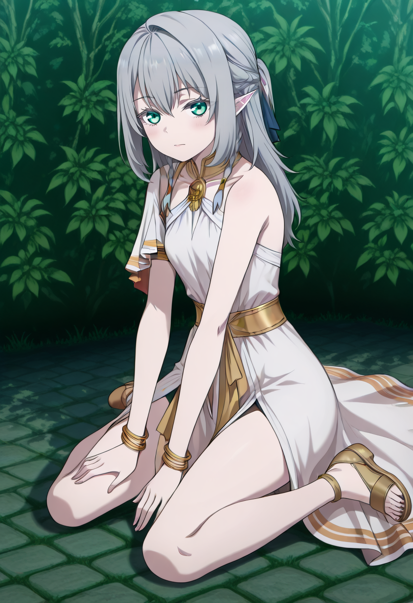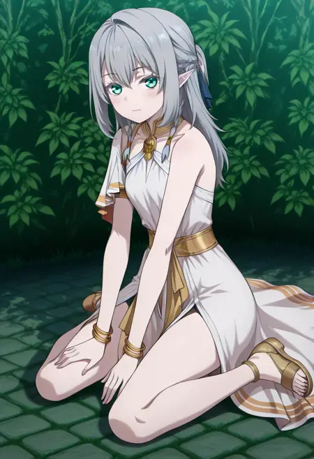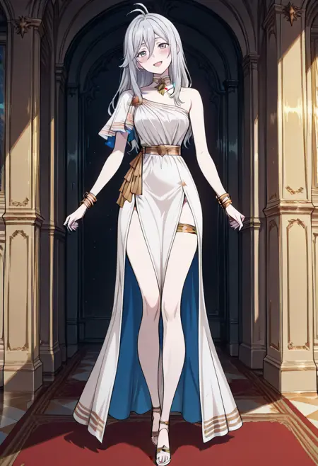 cha14v1,1girl,,white dress,gold accents,high slit,side slit, single bare shoulder,bare back,gold belt,tassel,sandals,grecian,fantasy,jewelry,bracelet,anime screencap