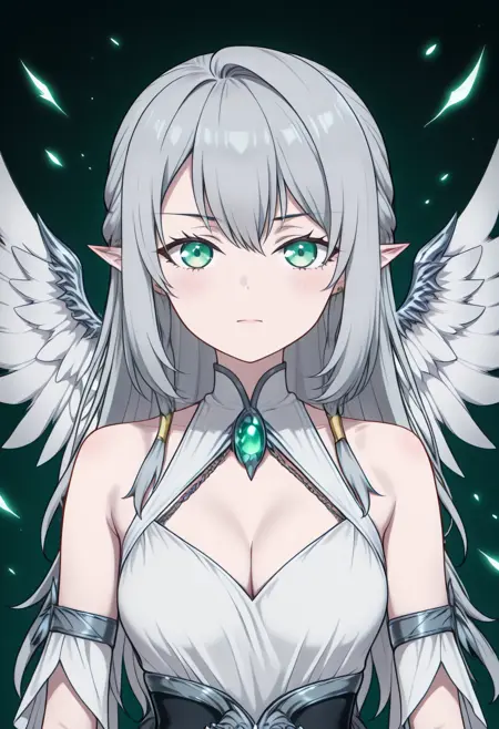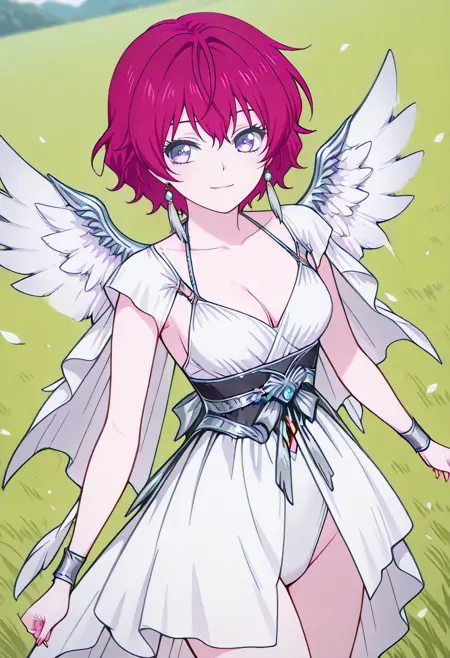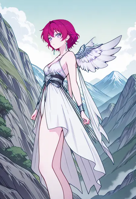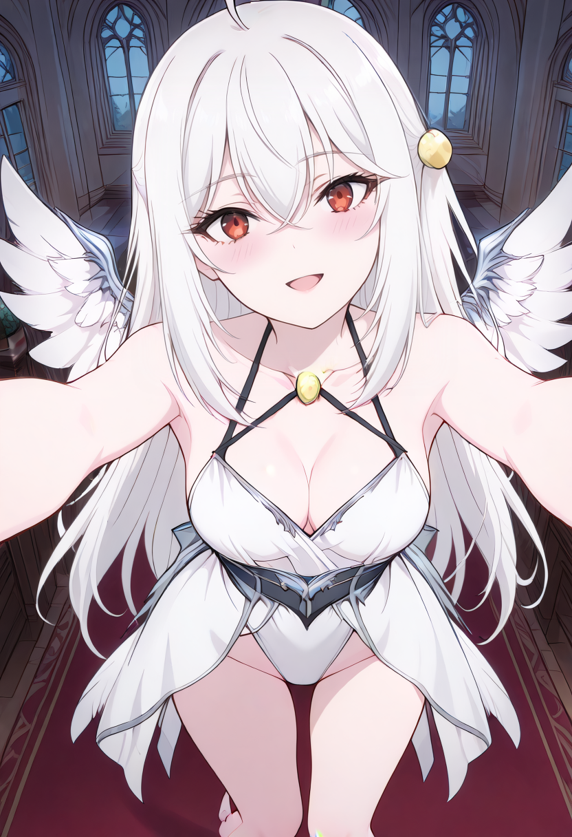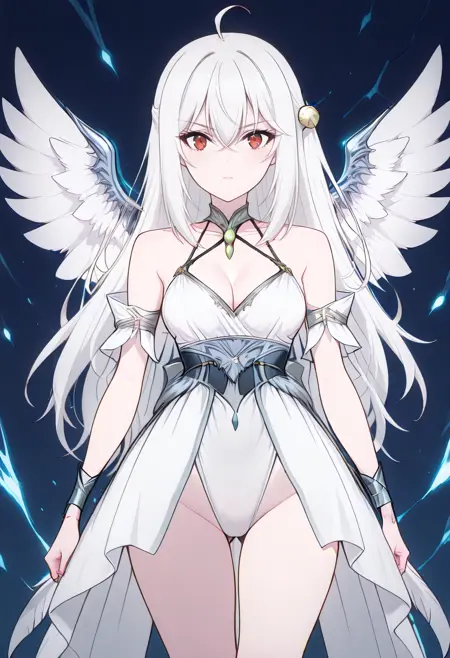 cha15v1,white mini dress,high leg,winged sleeves,attached wings,deep cleavage,bare legs,halterneck,bare feet,backless,flowing fabric,wide belt,dark belt,blue gem,silver accents,fantasy,angelic,anime screencap