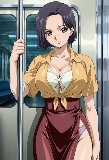 기본: hanae_i, 1girl, 애니메이션 컬러링, 레트로 아트스타일, 단독, 단발, 검은 머리, 갈색 눈, 노란색 끈셔츠, hanae 흰색 어깨없는 셔츠, 단추 틈, 단기 소매, 하이웨이스트 치마, 사이드 슬릿, 빨간 치마, 보라색 속옷, 벌어진 셔츠, 큰 가슴, 가슴 틈