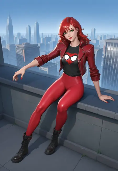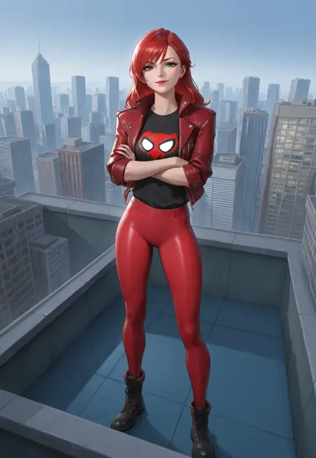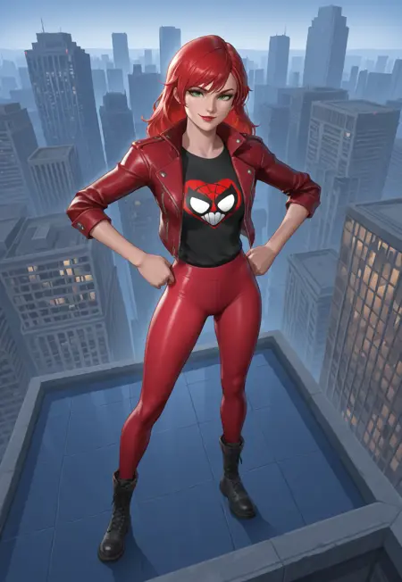 MJWatsonF, 1girl, solo, red hair, long hair, green eyes, red lips, cropped brown leather jacket, sleeves rolled up, black shirt, red tight pants, lace-up boots,