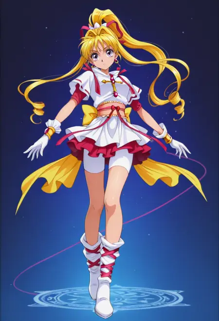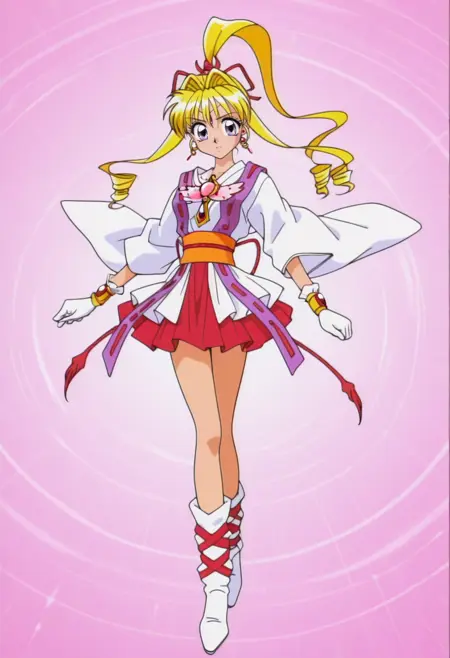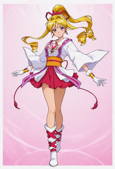 kaitoujeannev1,金发,长发,珠宝,耳环,紫色眼睛,马尾辫,手套,丝带,魔法少女,裙子,发带,双马尾,日本服饰,胸针,红裙,钻头发型,宽袖,靴子,