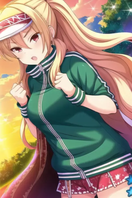 seio_cheer: cheerleading, skirt, red skirt, pom pom(cheerleading), high ponytail, scrunchie,