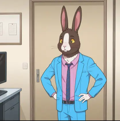 anthro, furry, rabbit, multi-colored fur, fur, whiskers, orange sclera, black eyes