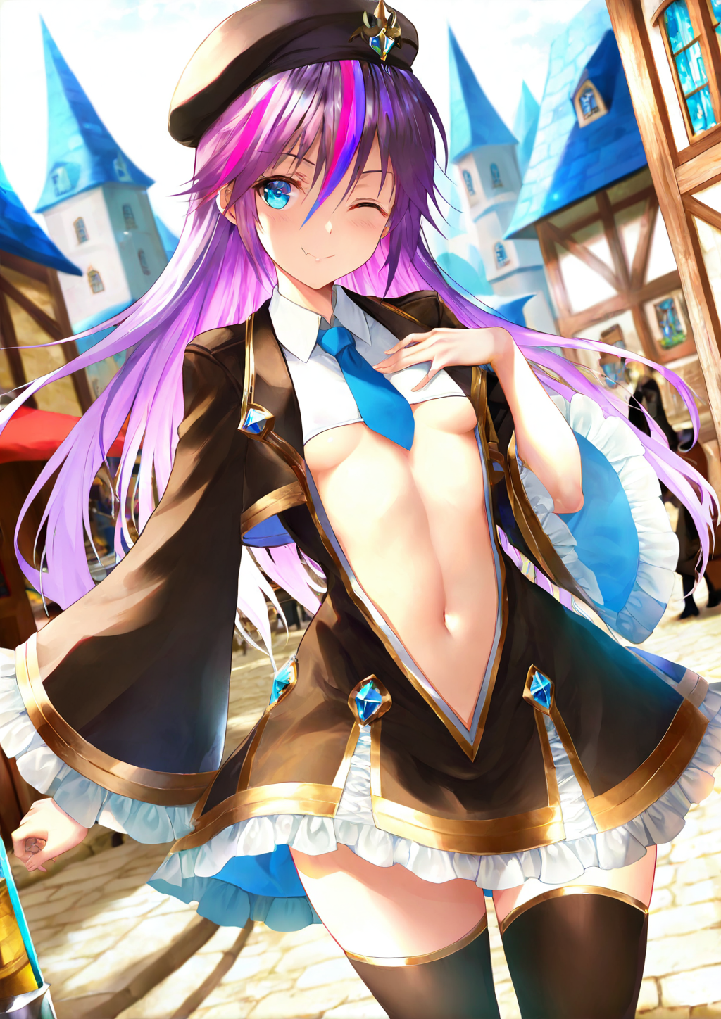 | 训练词汇 | windis,purple hair,multicolored hair,long hair,hair between eyes,blue eyes,fang,small breasts,fantasy,black dress,open dress,short dress,frilled dress,center opening,clothing cutout,crop top overhang,underboob,stomach,black jacket,wing collar,gold trim,white collared shirt,wide sleeves,blue necktie,black thighhighs,ankle boots,black hat,beret,bow,jewelry已复制! |