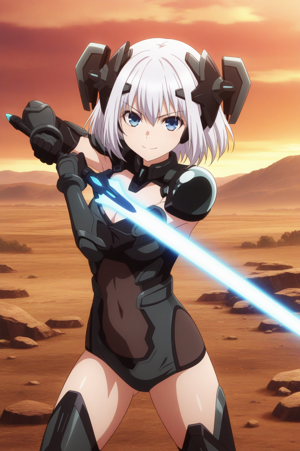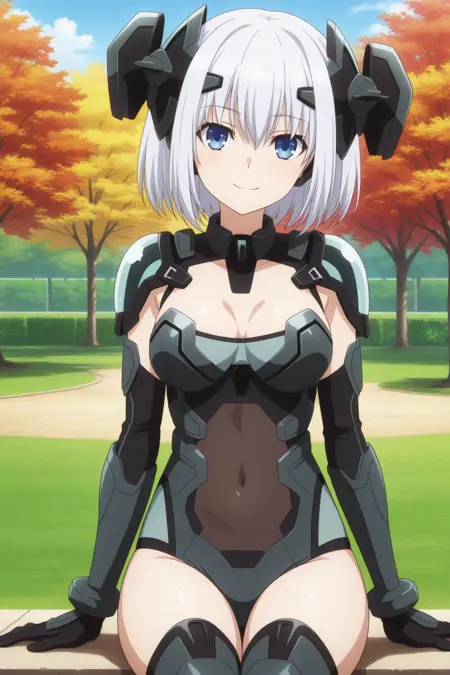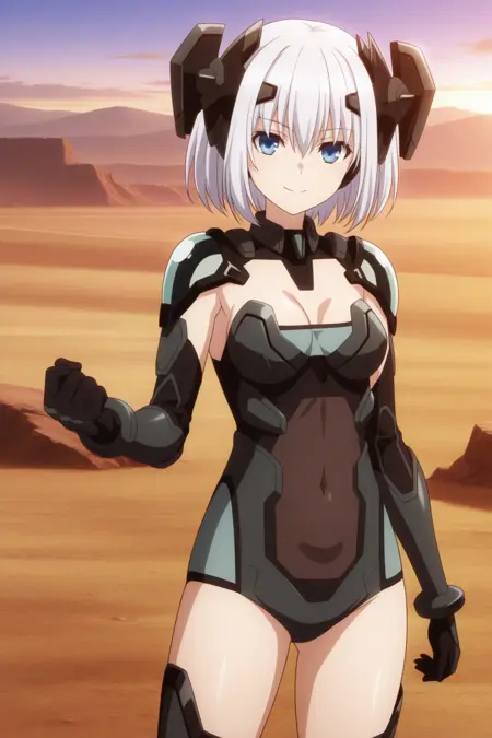 aaorigami, blue eyes, white hair, origamiast, headgear, black leotard, covered navel, shoulder pads, elbow gloves, black gloves, anime coloring,