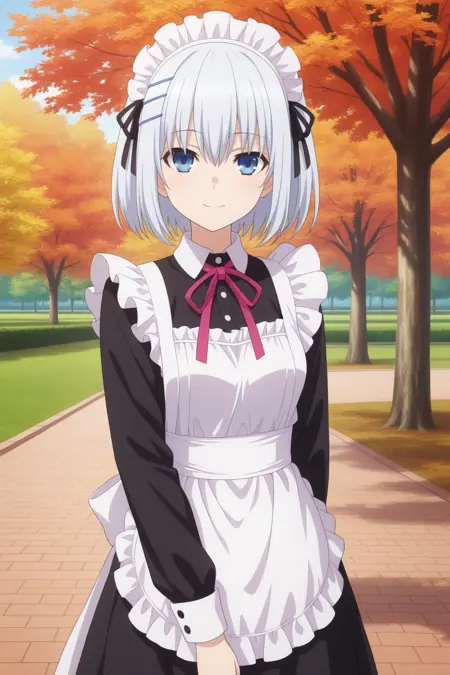 aaorigami, blue eyes, white hair, origamischool, hairclip, school uniform, red neck ribbon, white dress shirt, black blazer, blue skirt, pleated skirt, anime coloring,
