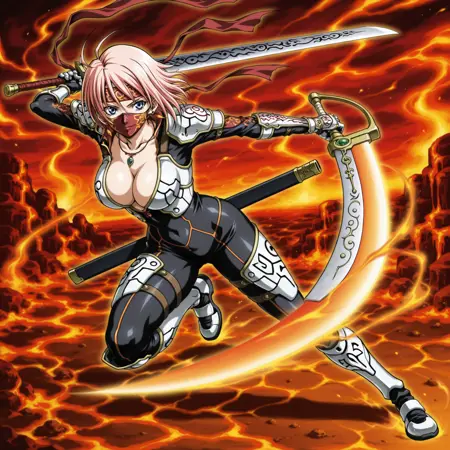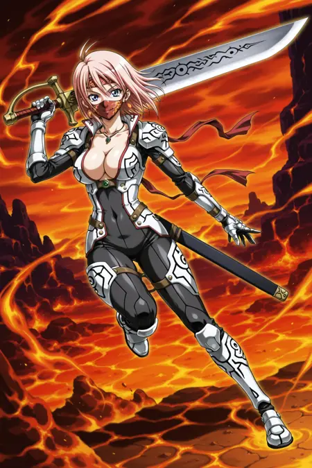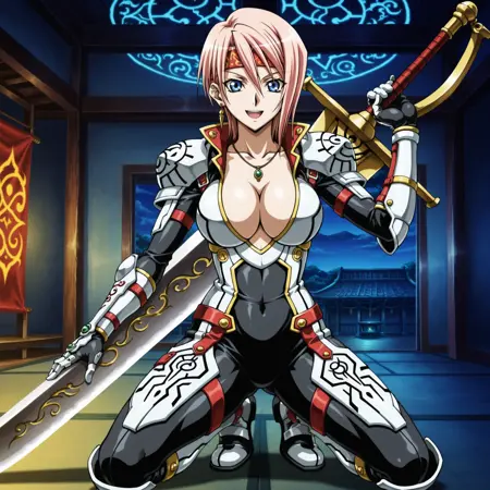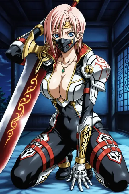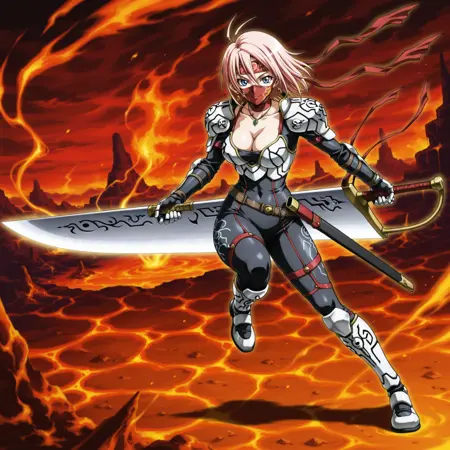 yugioh_card_style, yugioh_card_for_dd_assailant, blue eyes, light pink hair, short hair, earrings, necklace, large breasts, collarbone, covered navel, cleavage, smile, headband, cloth mask, fabric face cover, white futuristic armor, segmented armor plates, arm guards, shin guards, multicolored wristbands, rune patterns, armored gloves, leg straps, tight bodysuit, gold and red details, black inner armor, large sword, oversized blade, rune-engraved blade, glowing inscriptions, magical sword, heavy weapon,sheath on back