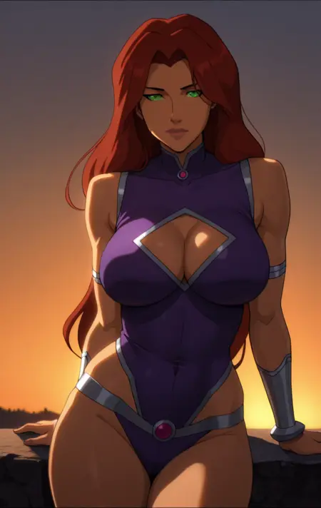 1girl, solo, long hair, breasts, looking at viewer, large breasts, green eyes, outdoors, red hair, leotard, arm support, covered navel,st4rf1r3,