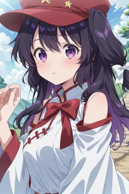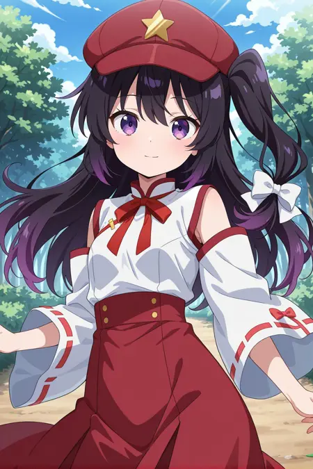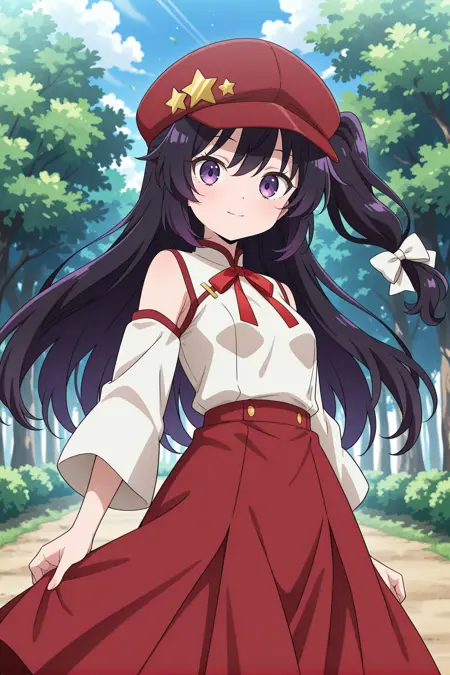 red hat, newsboy cap, star hat ornament, hair bow, white bow, red neck ribbon, mandarin collar, white shirt, sleeveless shirt, white sleeves, wide sleeves, detached sleeves, red skirt,