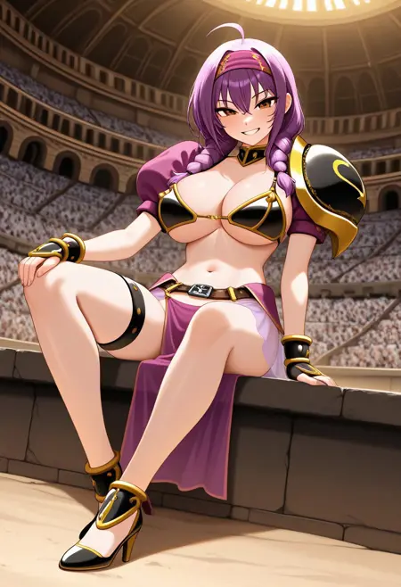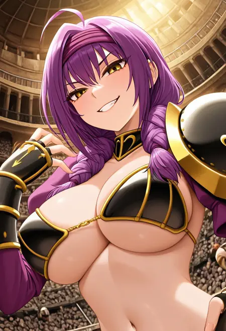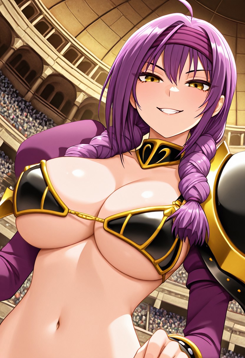 - 紫色头发,长发,呆毛,双马尾,金色吊梢眼,大胸部,