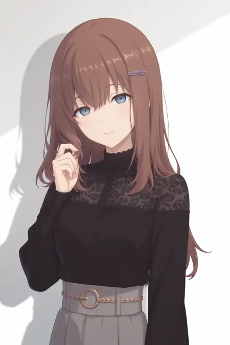 ShionEri, brown_hair, blue_eyes, hair_clip, long_hair, bangs, black_sweater, long_sleeves, grey_skirt, high-waist_skirt, belt,