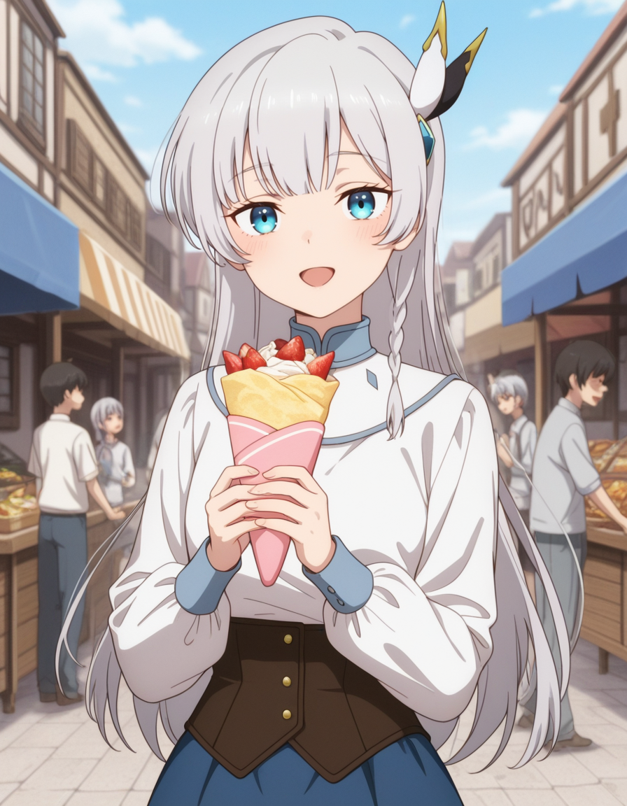 <lora:allucia_citrus-katainaka_no_ossan_s1-ixl-anime-soralz:1>, allucia citrus 2 (katainaka no ossan), 長い髪、灰色の髪、まっすぐな前髪、片側編み込み、羽飾りの髪飾り、青い目