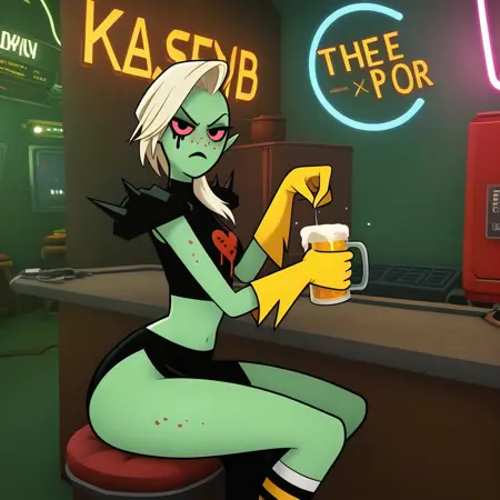 4byss_b4r, green lights, red fridge, lamp, yellow neon, neon sign, chair, bar counter, bar, english text, display,