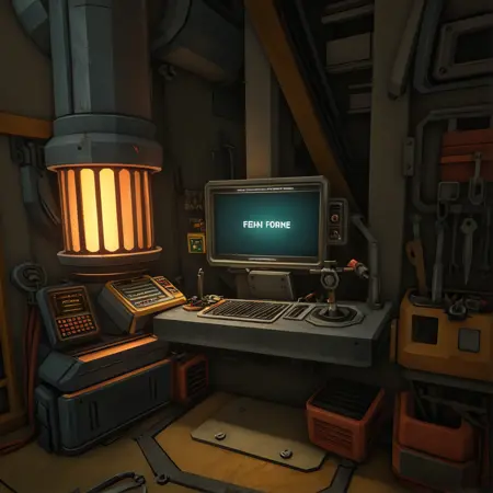 c4b1n, yellow door, toolbox, blue hologram, technology, control panel, keyboard, lamp, english text, steel casket, green display, poster, wall,