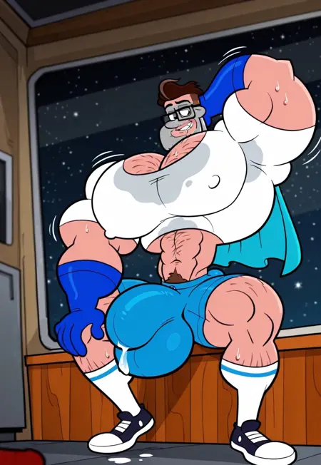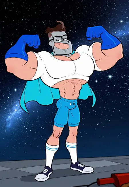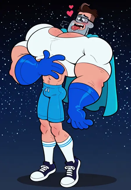 l4d, brown hair, black eyes, glasses, grey mask, white crop shirt, blue cape, blue shorts, blue gloves, white socks, sneakers