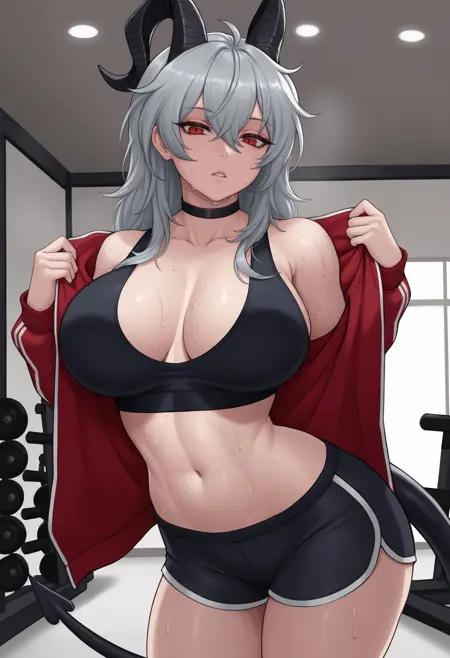 민소매: 검은 꼬리, 악마 꼬리, 불꽃 끝 꼬리, 긴 머리, 회색 머리, 눈 사이의 헤어, 검은 뿔, 염소 뿔, 악마 뿔, 붉은 눈, 흰 셔츠, 칼라 셔츠, 민소매 셔츠, 찢어진 셔츠, 셔츠 안으로 넣음, 팔 스트랩, 팔 리본, 빨간 리본, 검은 장갑, 검은 바지, 하이웨이스트 바지, 벨트 주머니, 귀걸이, 검은 초커, 드러난 어깨, collarbone, 가슴 사이, 큰 가슴