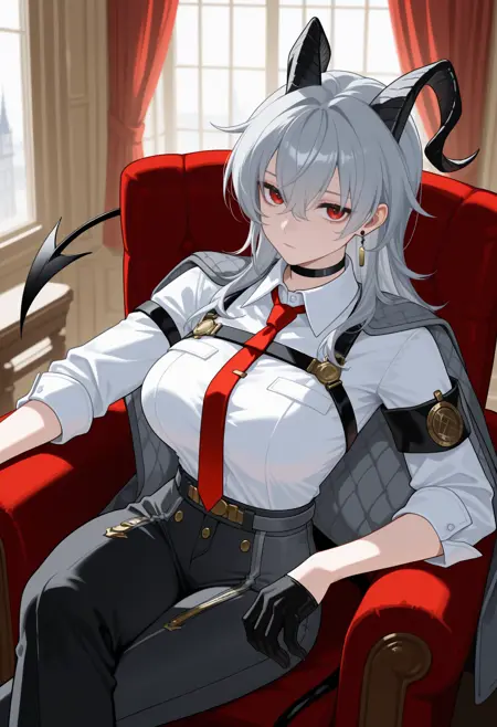 기본 복장: 검은 꼬리, 악마 꼬리, 긴 머리, 회색 머리, 눈 사이의 헤어, 검은 뿔, 염소 뿔, 악마 뿔, 붉은 눈, 회색 코트, 어깨에 걸친 코트, 흰 셔츠, 칼라 셔츠, 셔츠 안으로 넣음, 빨간 넥타이, 가슴 하네스, 팔뚝이 팔꿈치를 넘음, 검은 팔밴드, 검은 장갑, 반장갑, 검은 바지, 귀걸이, 검은 초커, 큰 가슴