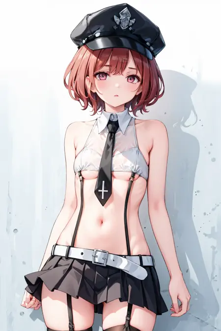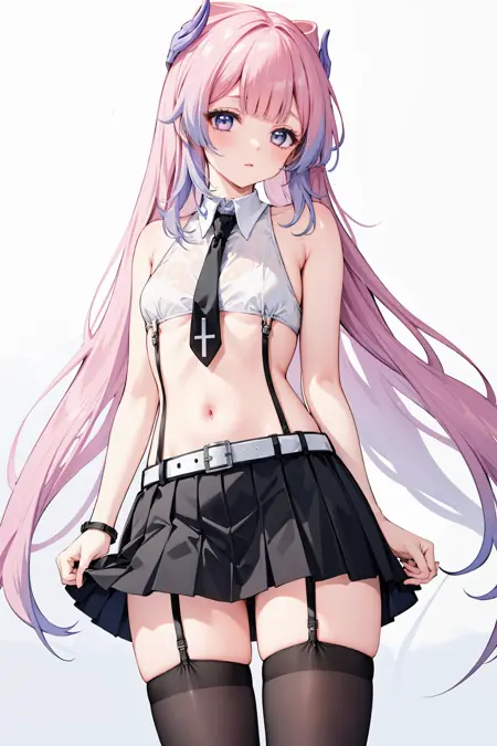 提示词:suspender skirt, sleeveless shirt, garter straps, thighhighs, black necktie, belt, navel/crop top