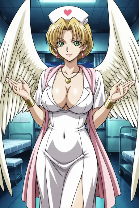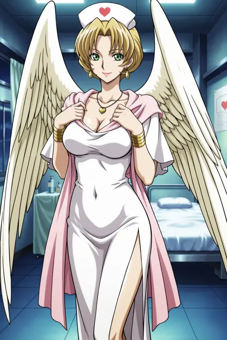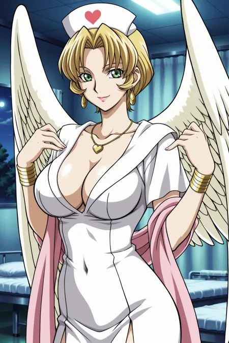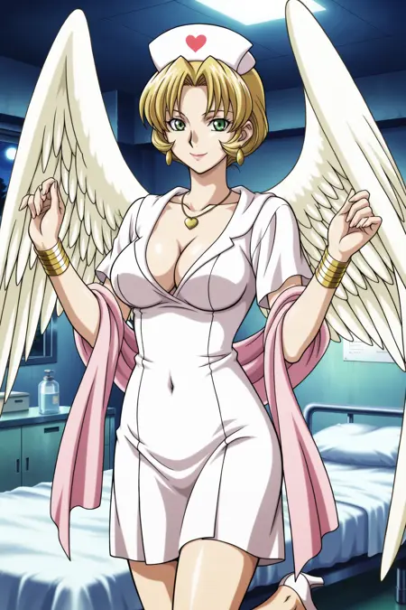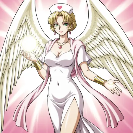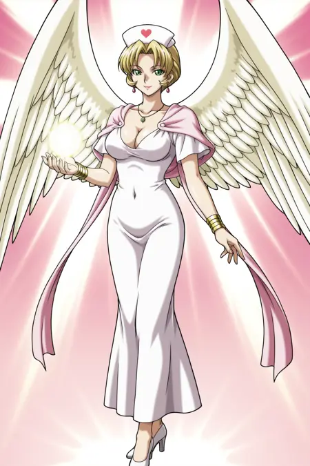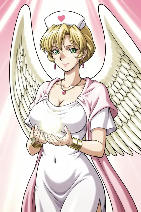 yugioh_card_style, yugioh_card_for_numinous_healer, green eyes, blonde hair, short hair, lips, earrings, necklace, large breasts, collarbone, covered navel, cleavage, smile, white robe, pink shawl, golden bangles, nurse cap, heart symbol, medical-themed accessory, minimalist costume, angelic attire, soft fabric, white angel wings, feathered wings, large wingspan, divine features, white high heels