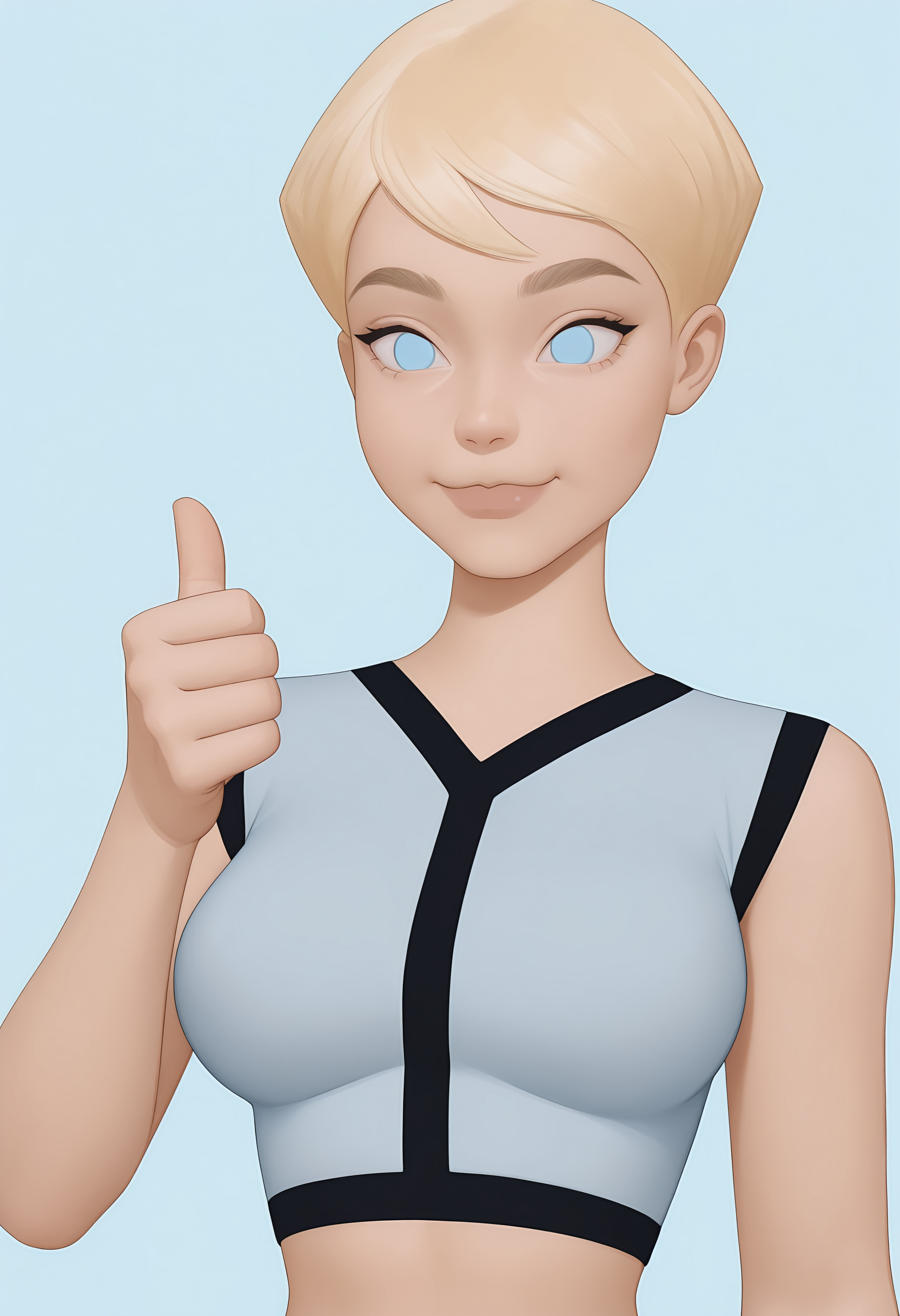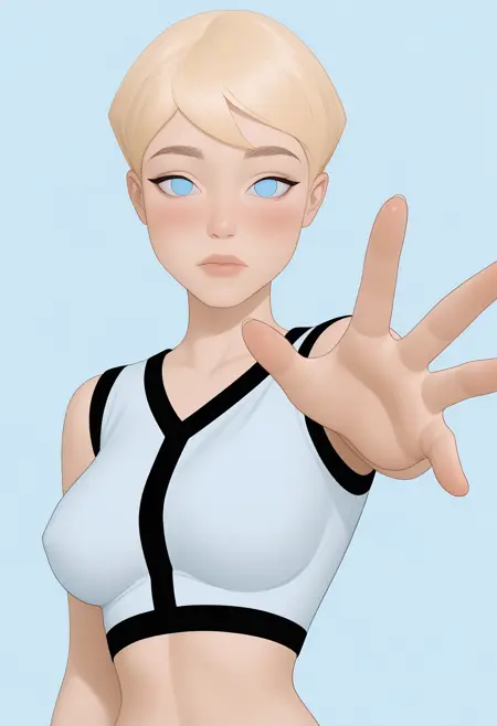 ch3ilf, 1girl, ブロンドの髪, 短髪, 青い目, 肩出し, キャップトップ, 胸, スカート