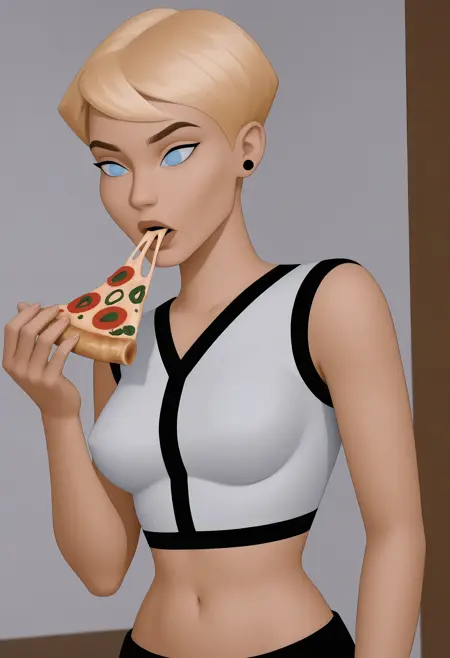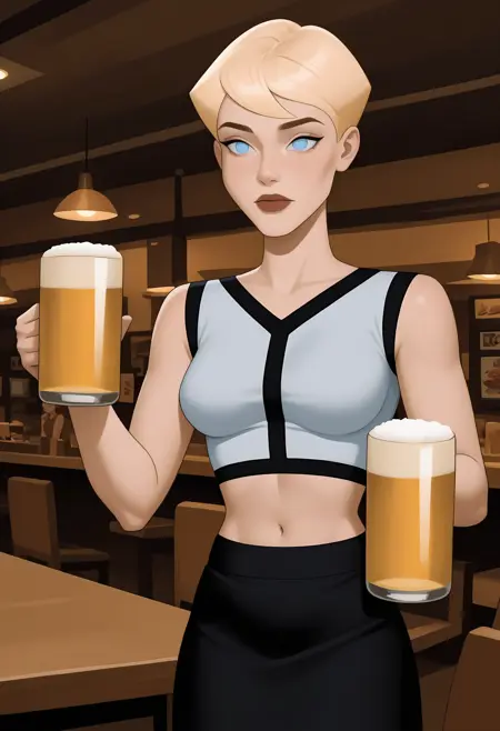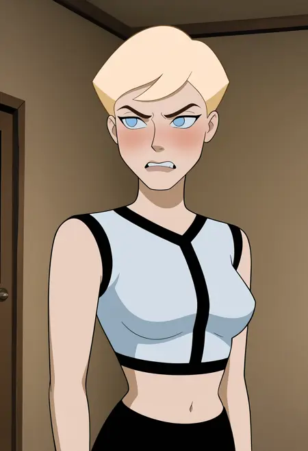 ch3ilf, 1girl, 金发, 短发, 蓝眼睛, 无袖, 露脐上衣, 乳房, 裙子