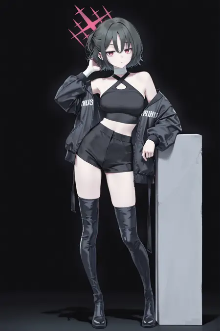 black jacket, midriff, jacket partially removed, halterneck, thigh boots,