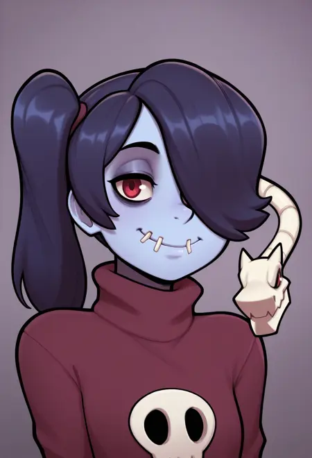 Character Tags: blue skin, zombie, stitches, stitched mouth, blue hair, side ponytail, hair over one eye, long hair, red eyes, object through head, skeletal hand