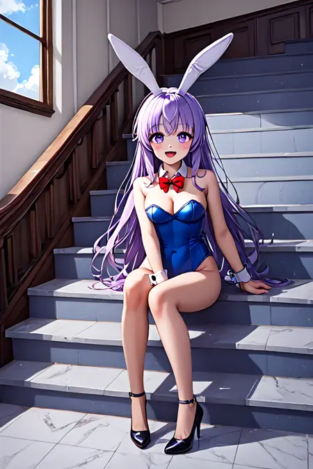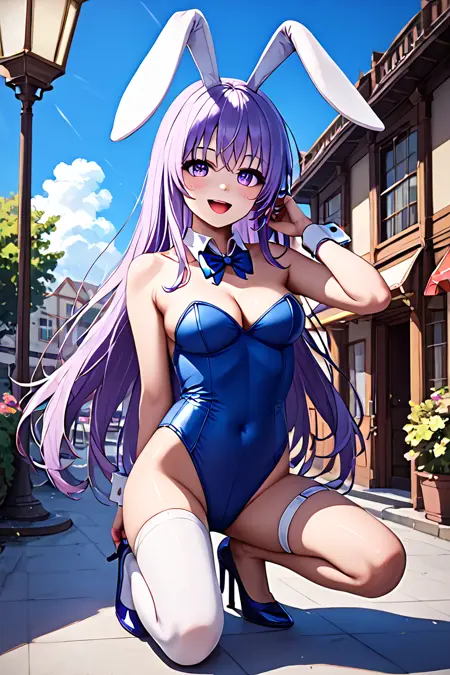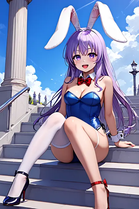 erina, 1个女孩, 单人, 长发, 过膝袜, 蝴蝶结, 动物耳朵, 极长发, 紫色眼睛, 全身, 紫色头发, 领结, 兔耳朵, 紧身衣, 高跟鞋, 手腕 cuffs, 分离式衣领, 时尚女郎, 单条过膝袜, 挺胸,