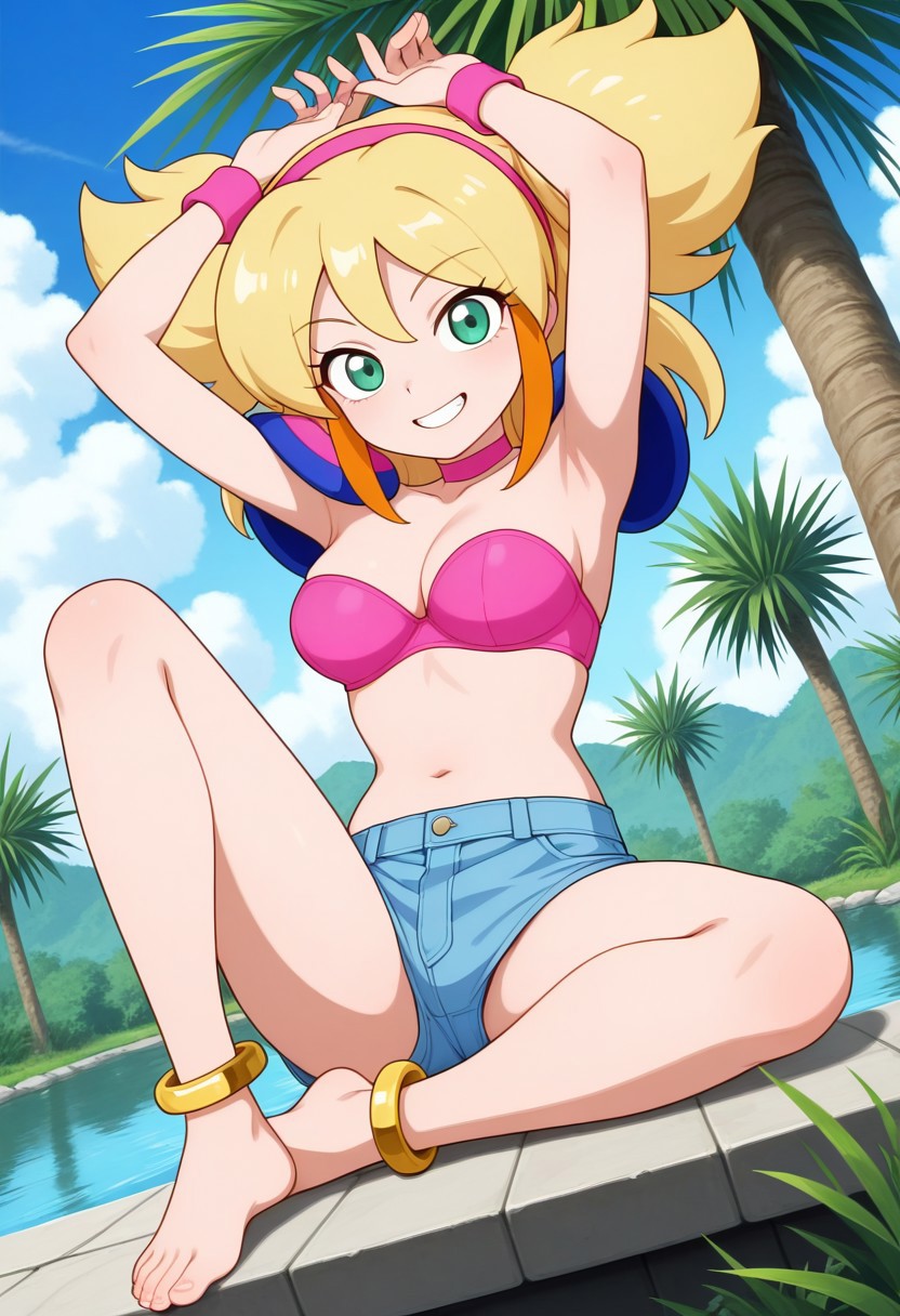 浅粉色腕带,牛仔短裤,金色环形脚链,赤脚,