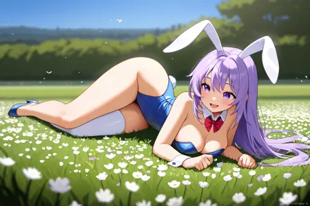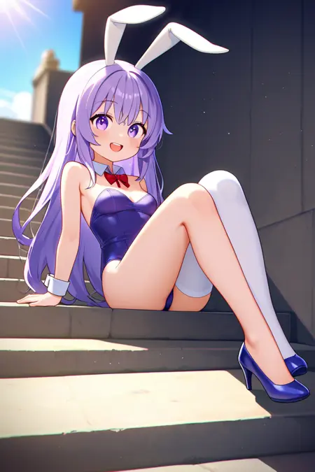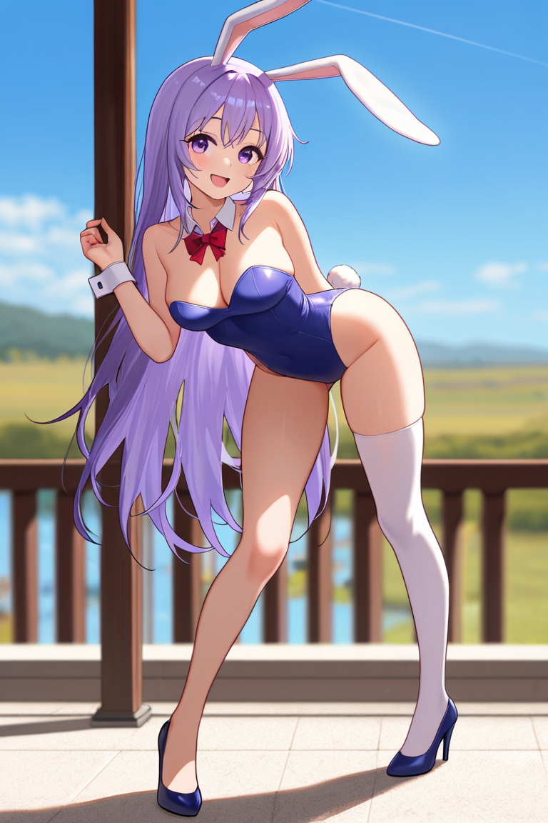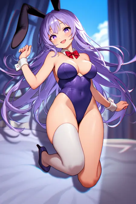 erina, 1girl, ソロ, 長い髪, 太ももハイソックス, リボン, 動物の耳, 非常に長い髪, 紫色の目, フルボディ, 紫色の髪, ボウタイ, 兎の耳, リークス, ハイヒール, 手首の cuffs, 別れ襟, プレイボーイバニー, 片方の太ももハイソックス, 胸元